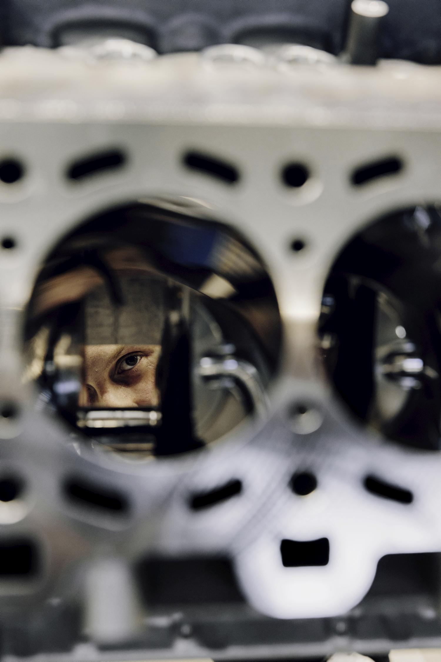 Una persona se inclina sobre un motor en la tranquila nave de Affalterbach, Alemania. Su rostro muestra una expresión…