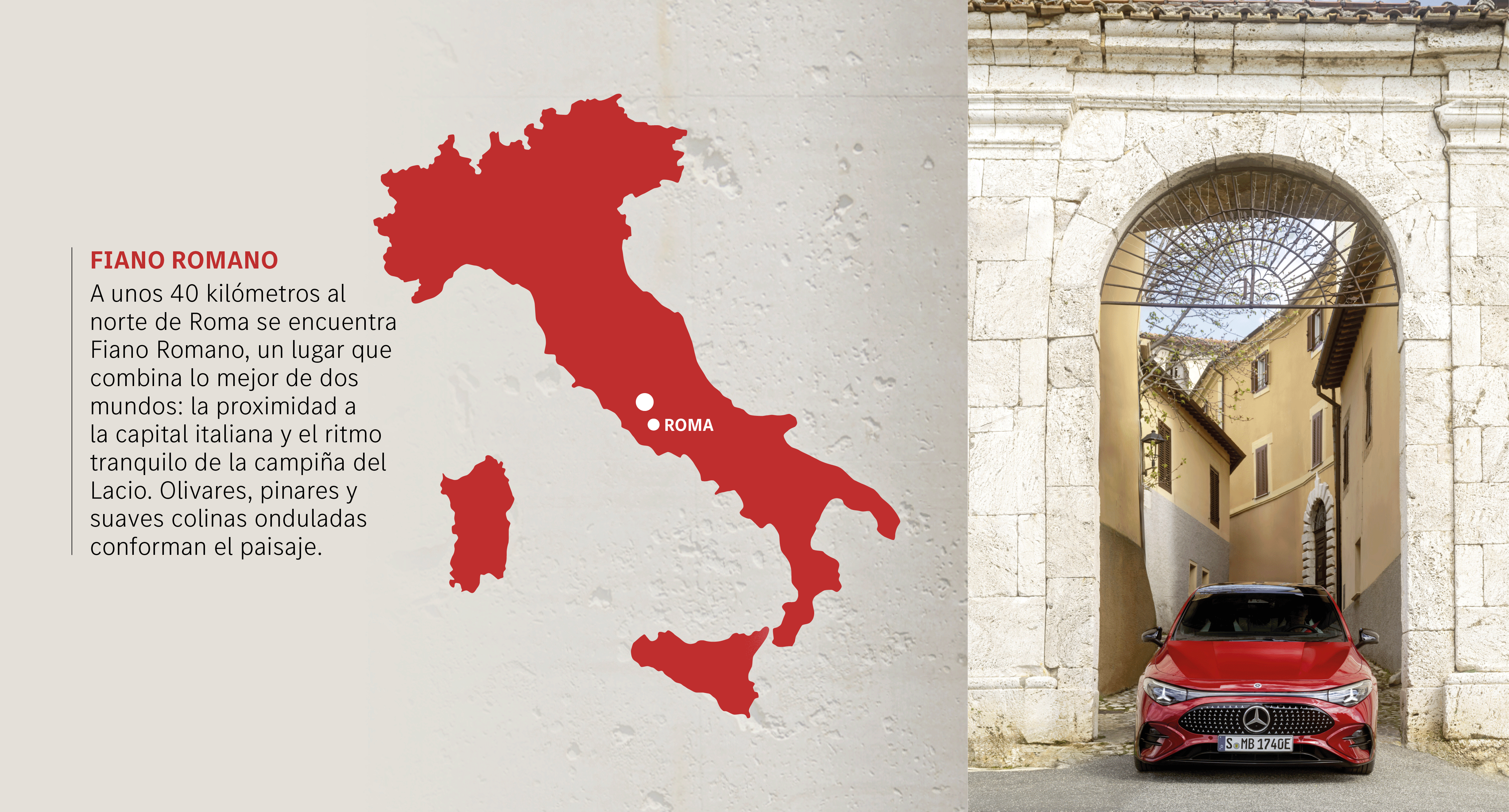 Aunque todos los caminos lleven a Roma, en esta historia se parte de ella. Mientras el sol se pone, dejamos atrás la bulliciosa ciudad a bordo del nuevo CLA 100% eléctrico (presentado mundialmente, en la capital italiana, en marzo de 2025). El coche avanza en silencio hacia nuestra meta: Fiano Romano, 40 kilómetros al norte, donde reside la arquitecta Michela Ekström. Pero si algo hemos aprendido de nuestros viajes, es que no se trata solo de disfrutar del destino, sino también del camino. El CLA ofrece un confort excepcional: asientos deportivos, materiales reciclados de alta calidad, un ambiente sereno y la innovadora MBUX Superscreen que responde a voz, tacto y gestos. Está diseñado para aquellos que valoran la exclusividad, el rendimiento, la tecnología de vanguardia y un estilo de vida consciente con el medio ambiente, sin renunciar a la practicidad y la versatilidad en su día a día. Vamos a comprobarlo en nuestra ruta por la tierra de la Dolce Vita.