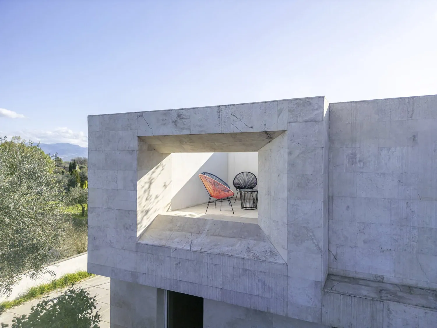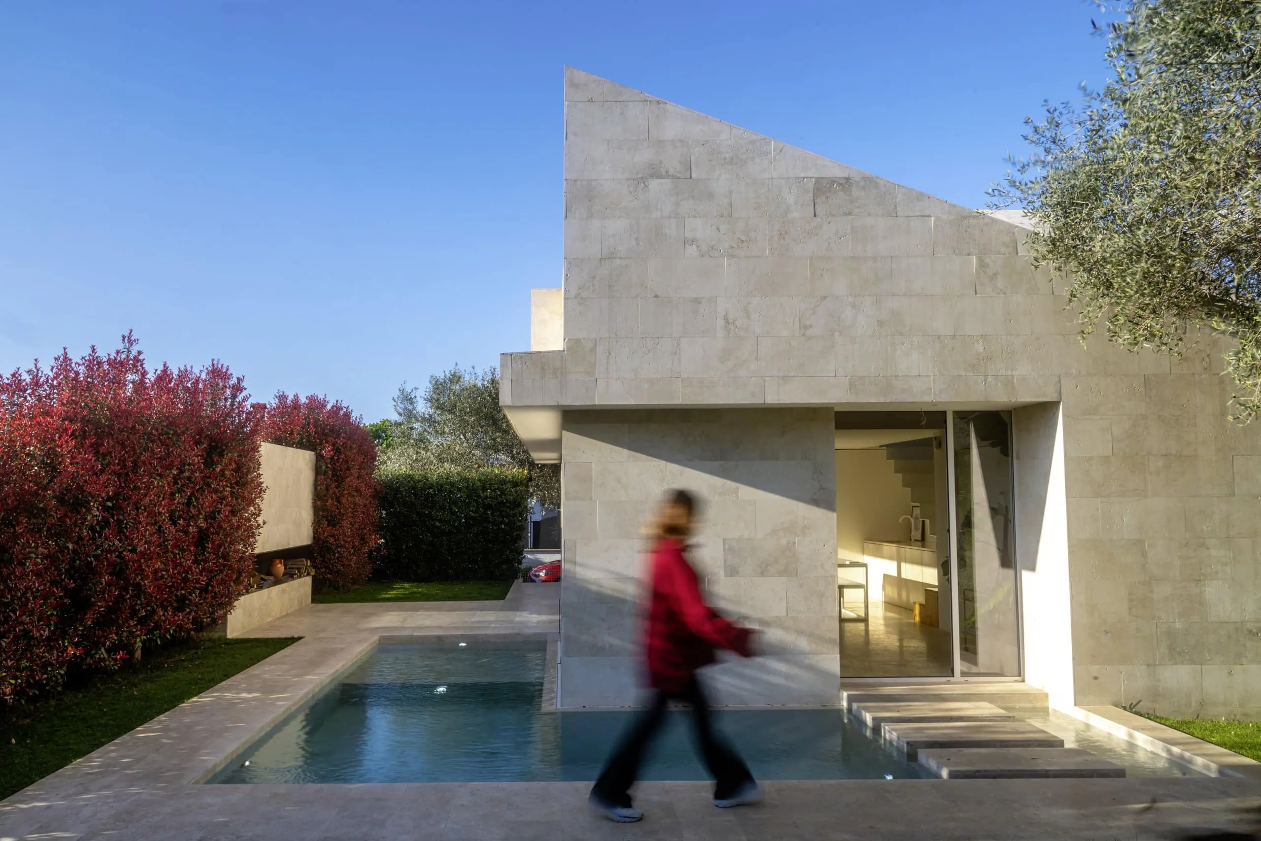 El material protagonista es el travertino (piedra típica y emblemática de Roma) que comunica el interior y el exterior. Michela lo utiliza en suelos, fachada, piscina, cocina y chimenea, creando un conjunto armonioso, contemporáneo y profundamente romano. Inspirada por un poema polaco, ve en esta roca una metáfora de las relaciones humanas: cercanas, distantes y complejas.