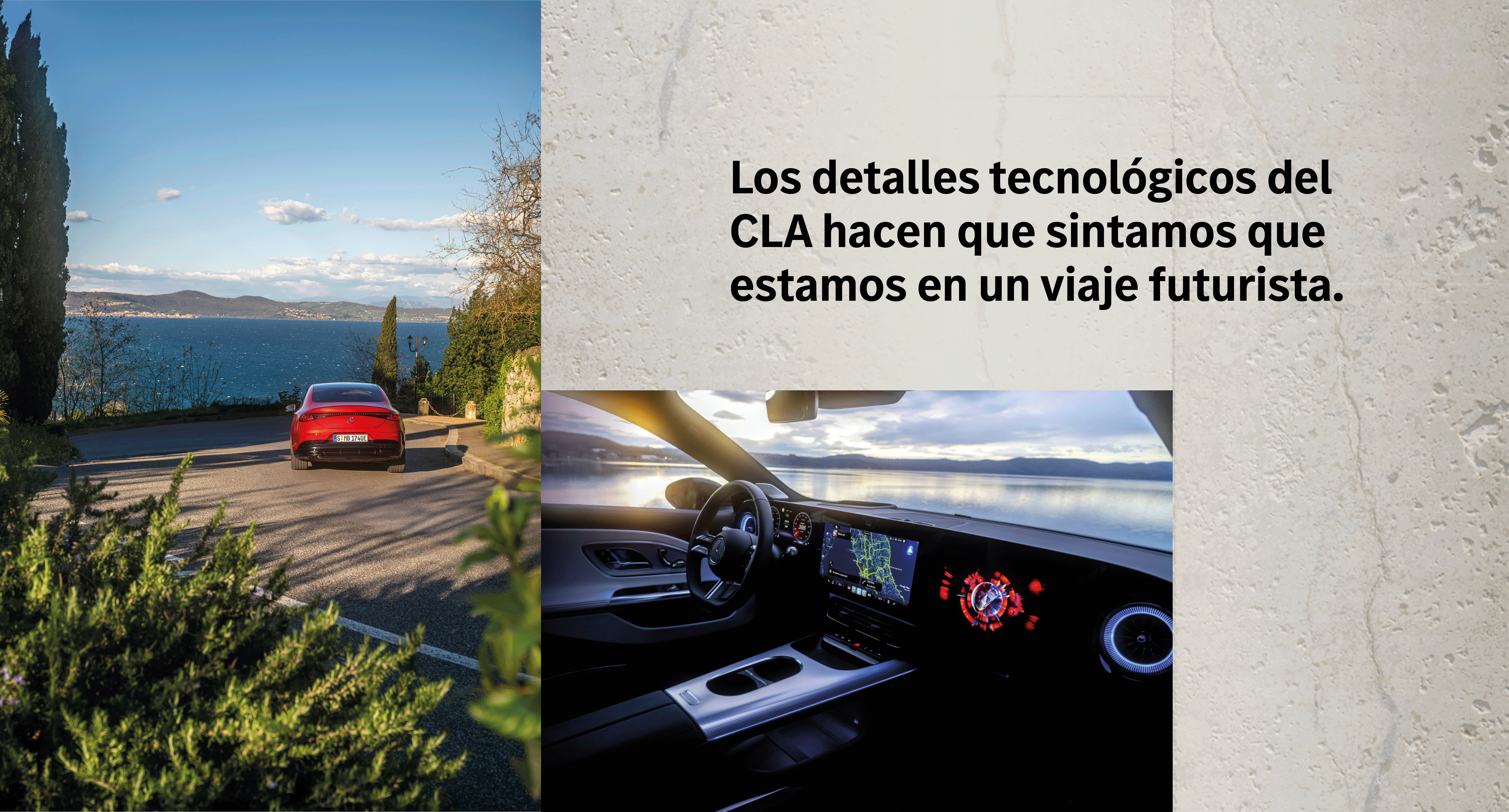 Llegamos al atardecer a Colle di Tora y Castel di Tora, dos pequeños pueblos medievales de la región del Lacio. Salimos del coche para contemplar el lago. La luz es suave, casi cinematográfica, y brillan los nuevos elementos de iluminación del CLA: el panel central, la estrella iluminada y las luces de conducción diurna. El CLA lo tiene todo: cautiva con su diseño y, además, es funcional. Ofrece un espacio interior generoso para cinco ocupantes y un maletero con una capacidad considerable.