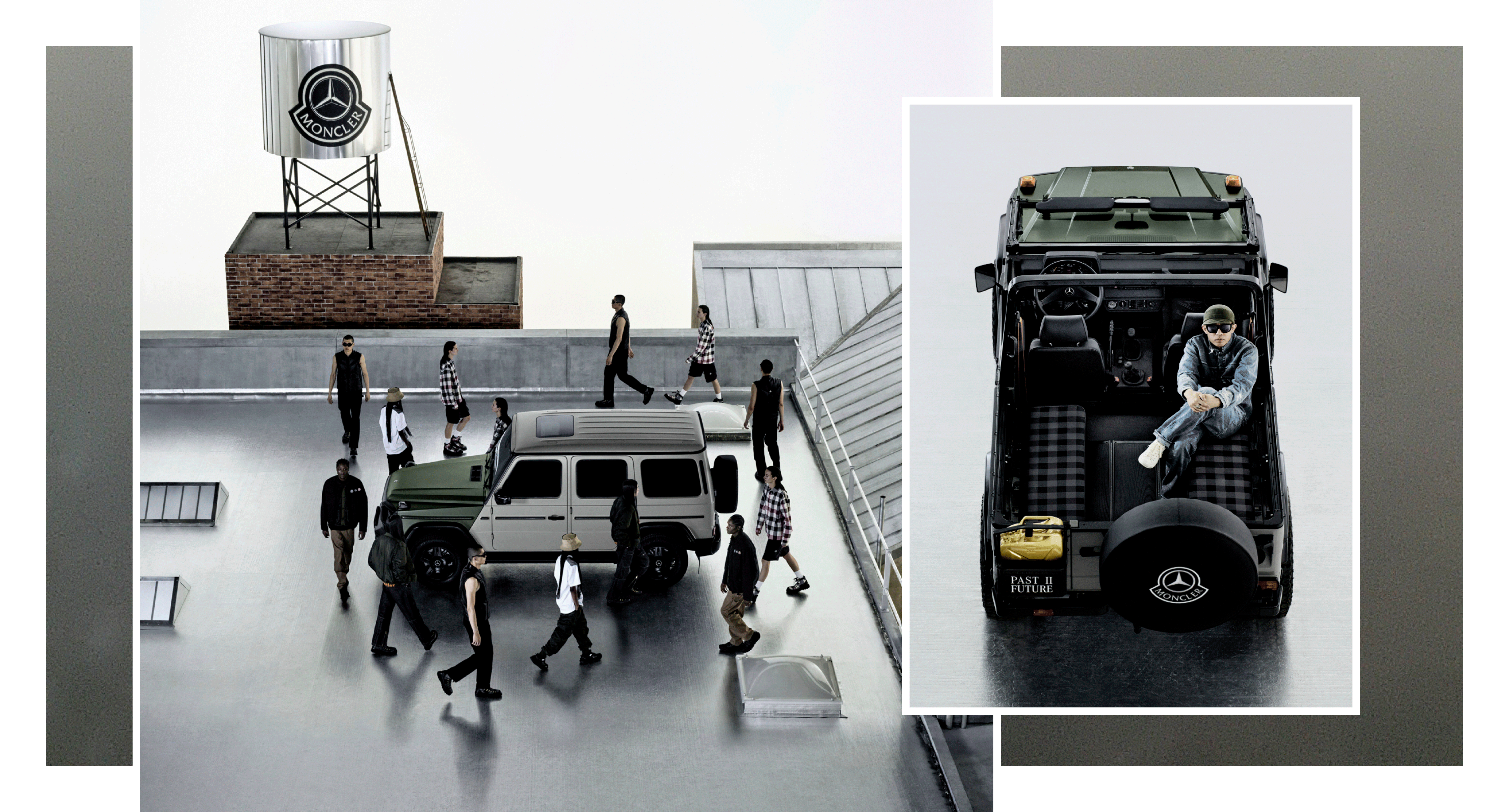 El punto de partida fue un Clase G Cabriolet de los años 80 y 90. Desde su exterior en verde oliva mate y gris hasta los estampados a cuadros de los asientos, que evocan la herencia de las carreras clásicas y la moda de los 80 y 90, el resultado es un vehículo que transmite emoción y una estética impecable. Las llantas de acero negras, el bidón de combustible dorado y la emblemática rueda de repuesto en la parte trasera remiten al carácter original del Clase G. A su vez, un nuevo sistema de sonido personalizado, desarrollado con el artista neoyorquino Devon Turnbull, eleva el resultado del proyecto. El techo acolchado, inspirado en las icónicas chaquetas acolchadas de Moncler, aporta un suave contraste a la silueta angular del todoterreno y sitúa el trabajo firmemente dentro del universo creativo compartido de la colaboración.