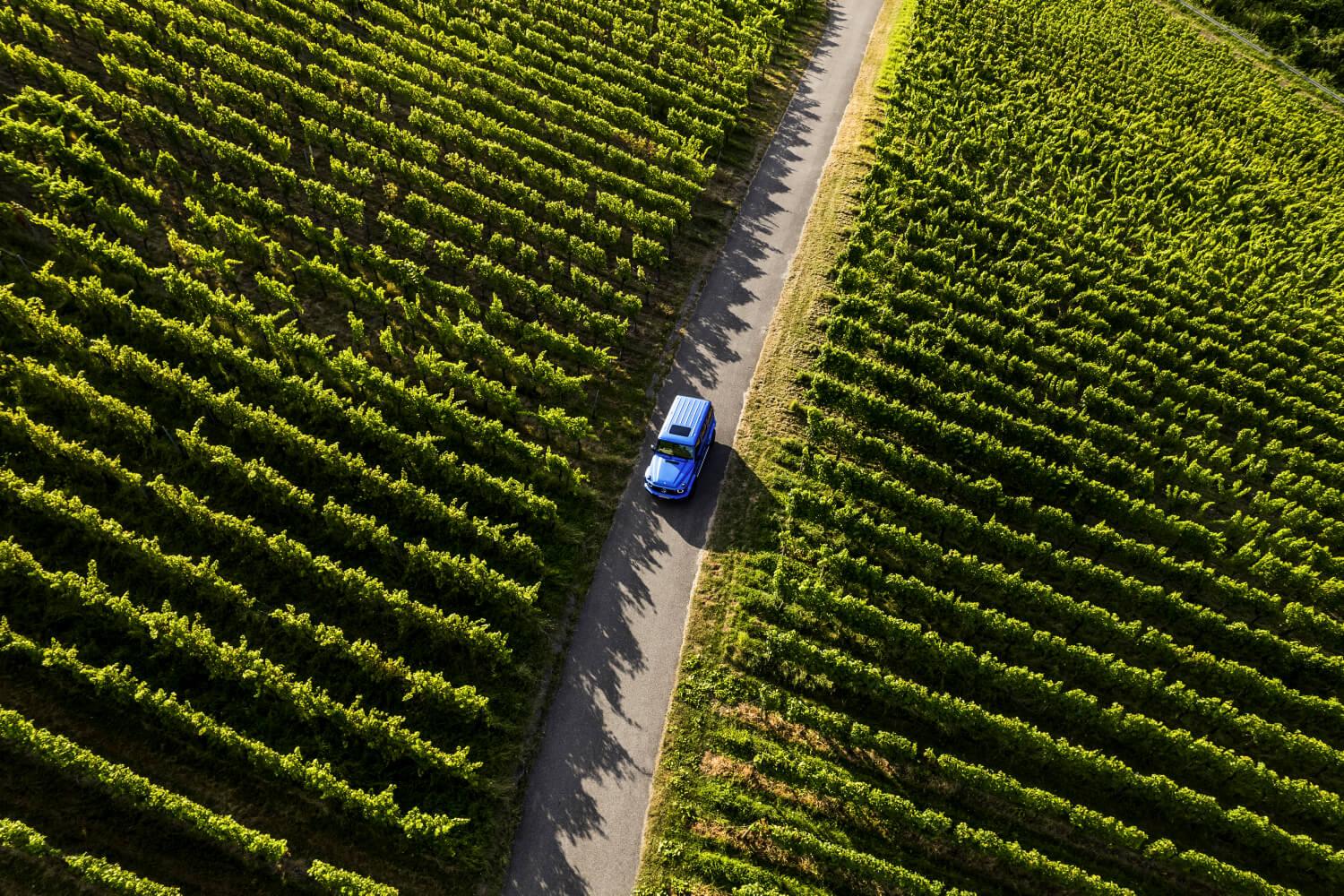 Dejamos la colonia por la tarde. El sol todavía brilla en lo alto mientras conducimos nuestro Clase G eléctrico por los viñedos. Sus patrones simétricos no se diferencian demasiado de las estructuras limpias de la Colonia Weissenhof, funcionales y estéticas al mismo tiempo, que nos muestran la huella que los hombres creamos y dejamos constantemente.