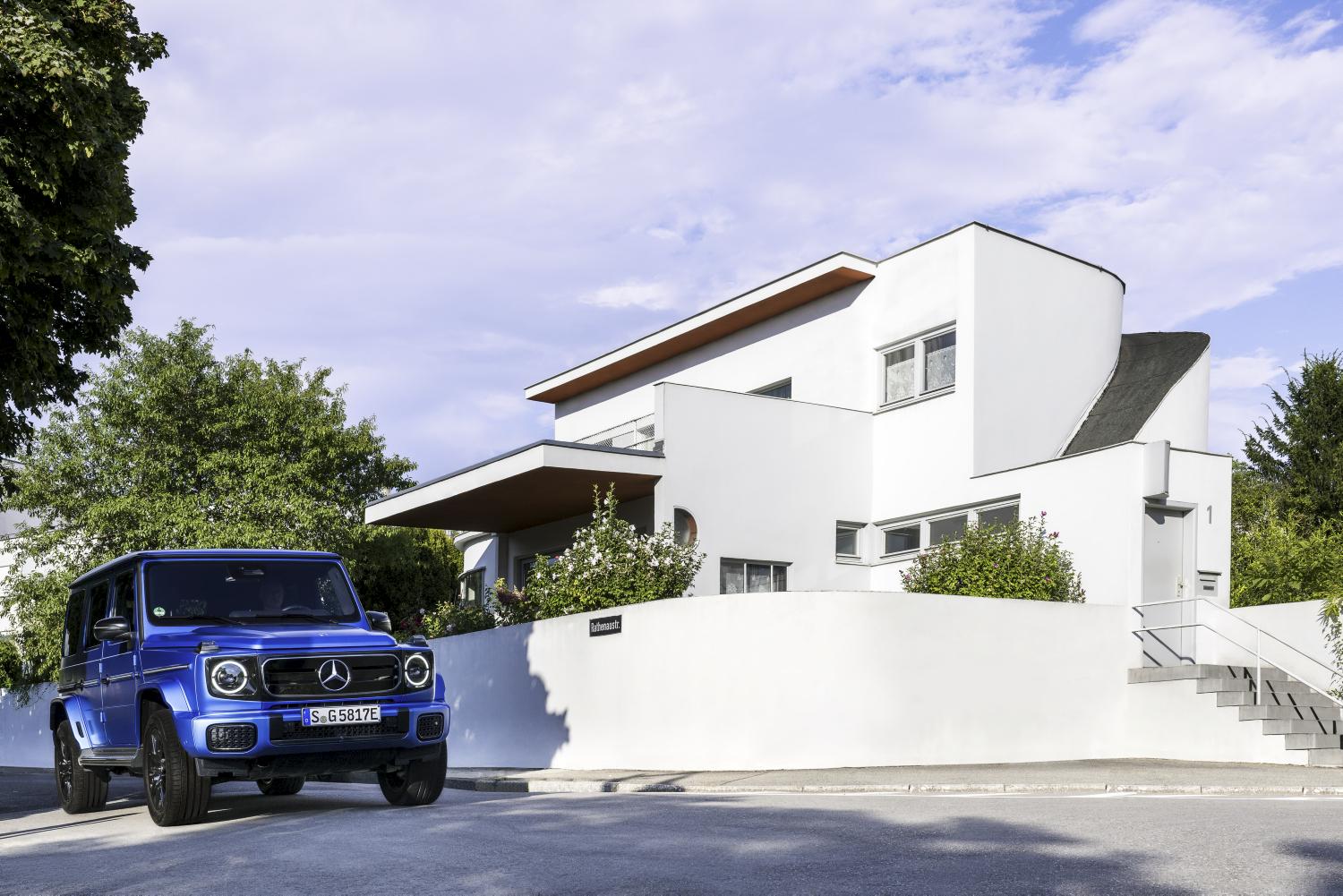 La colonia Weissenhof se erige sobre el monte Killesberg, y Stuttgart se extiende por el valle que hay justo debajo. Aparcamos nuestro Mercedes-Benz G 580 con tecnología EQ a un lado de la carretera. Hace un día soleado y la visibilidad es perfecta. En el horizonte, el Museo Mercedes-Benz destaca sobre el paisaje urbano y, un poco más al oeste, los viñedos visten las colinas con sus simétricos patrones.